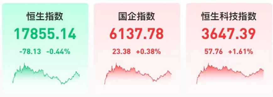 9月26日周一,港股今日走势震荡分化。开盘短暂走弱,后快速上行转涨,午后恒指再度下跌,尾盘指数上扬跌幅收窄。截至收盘,恒生指数收跌0.44%,报17855.14点;恒生科技指数涨1.61%,报3647.39点;恒生国企指数涨0.38%,报6137.78点。