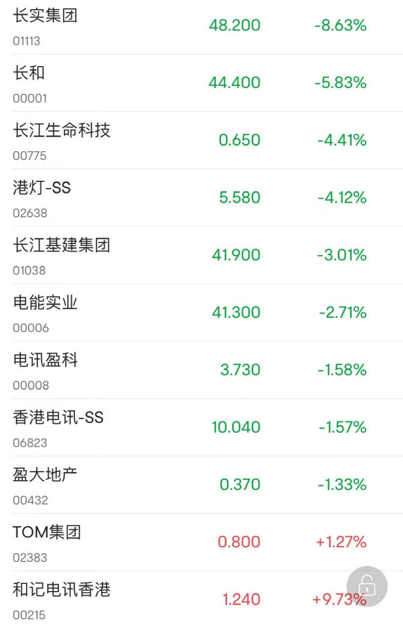 此外,长和系几乎全线下跌。长和跌近6%,长江生命科技、港灯跌超4%,长江基建集团跌超3%,电能实业跌近3%,电讯盈科、香港电讯、盈大集团跟跌超1%,仅主打社媒和电子商贸的TOM集团涨超1%,主打香港本地电讯漫游业务的和记电讯香港涨超9%。