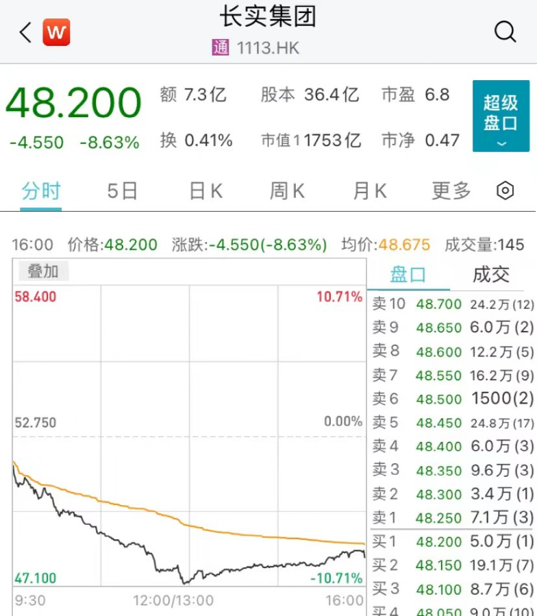李嘉诚旗下长实集团今日一度跌超10%,领跌一众蓝筹股与香港房地产股。长实集团收跌8.63%,报48.2港元/股,最新总市值1753亿港元,