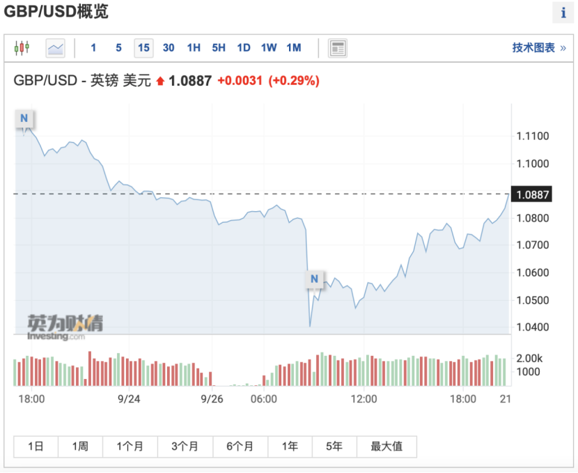 率先遭受冲击的是,英国外汇市场。9月26日早间,英镑遭遇惊险一刻,英镑兑美元汇率一度暴跌超5%,一度创出1985年以来新低,后续一路反弹,截至26日,英镑兑美元汇率为1.0887。