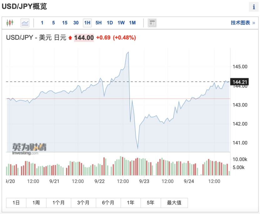 另外,日本政府在外汇市场打响的“日元保卫战”,可谓是异常激烈。9月26日,东京货币市场经纪公司发布测算数据称,日本政府于9月22日动用了创纪录的3.6万亿日元(约合250亿美元),是近24年来的首次卖出美元、买入日元的外汇干预。