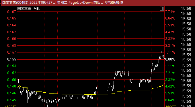 从二级市场看,国美零售今日盘中跌至0.143港元,跌幅一度接近8%,下午股价开始反弹并一度翻红,最终平收报0.155港元,总市值为55亿港元。