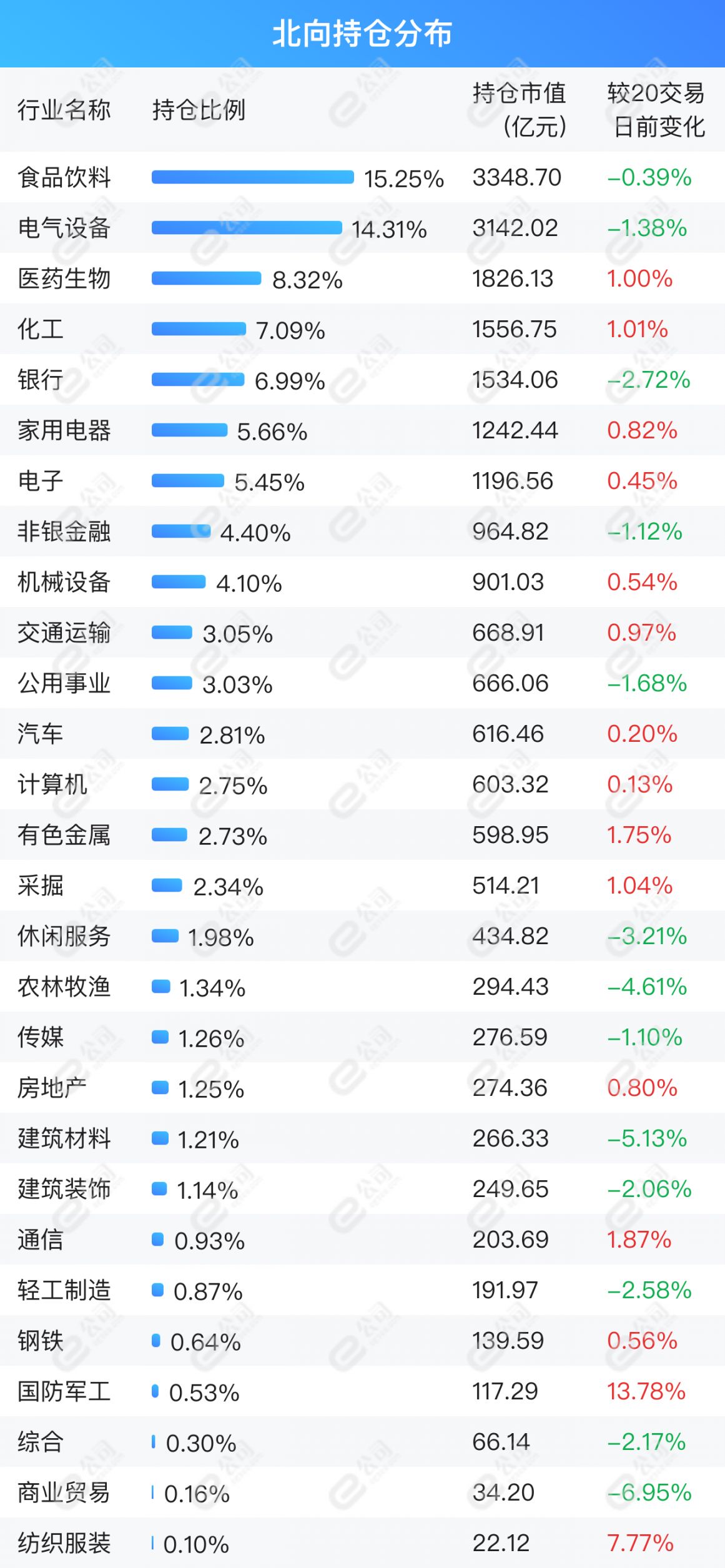 北向资金持仓市值前五行业为食品饮料、电气设备、医药生物、化工、银行,占持仓总市值51.97%。