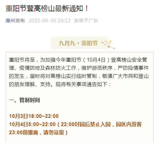 据“惠州发布”微信公众号9月30日消息,将对高榜山实行临时管制。管制时间:10月3日18:00~22:00、10月4日5:00~22:00(22:00封园后禁止入园,园区内游客23:00前撤离,请勿逗留)