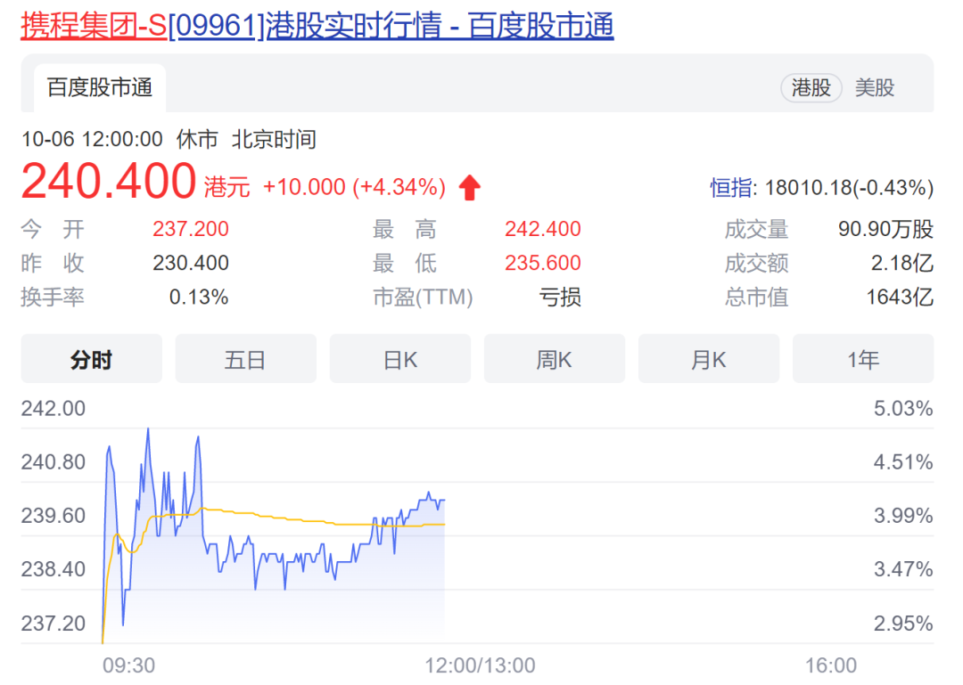 相比科技股走弱,港股旅游板块走强,10月6日,携程集团-S再度走强,逆市涨近4%,盘中一度冲击242港元,现报239.6港元/股,续创3个月新高,美股携程昨日收涨5.4%。