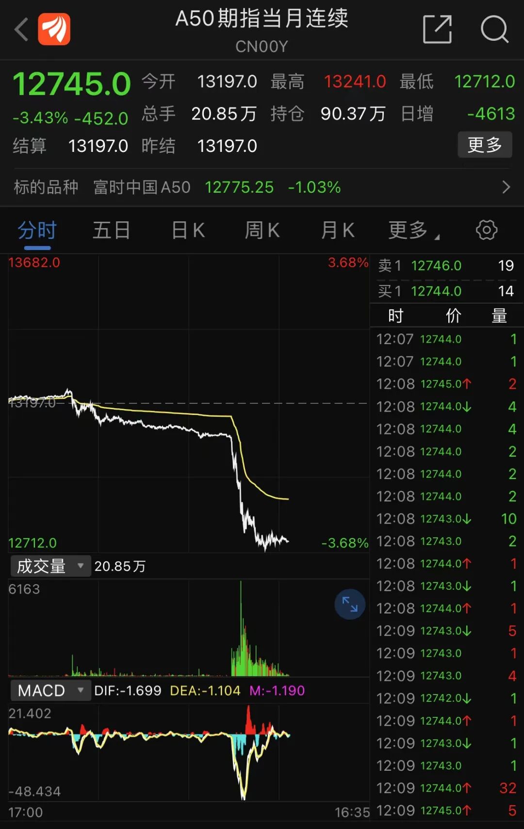 富时中国A50指数盘中跳水,现跌超3%。