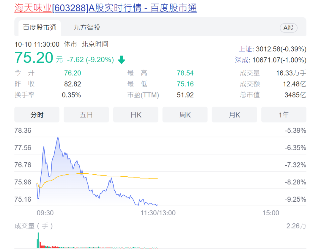受食品添加剂“双标”风波影响,“酱油一哥”海天味业开盘大跌7.99%。截至午间收盘,该股仍下跌超9%,最新市值3485亿元人民币。