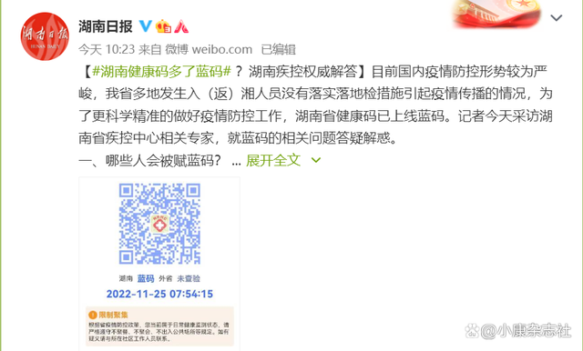 11月25日,有身在湖南的居民表示自己的“湖南省居民健康码”变为蓝色,湖南省疾控中心随后表示,蓝码主要赋予5天内由外省进入或者返回湖南的人员,被赋蓝码的居民正常工作、看病就医等,但不要往餐饮服务、购物中心、商场超市、美容美发、网吧酒吧等公共场所。