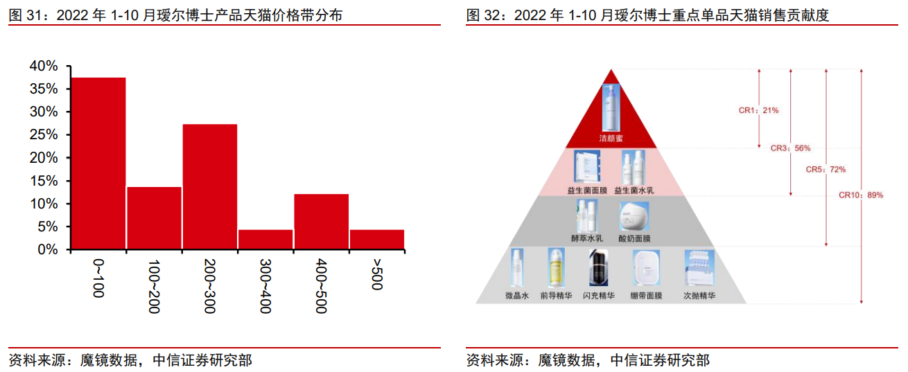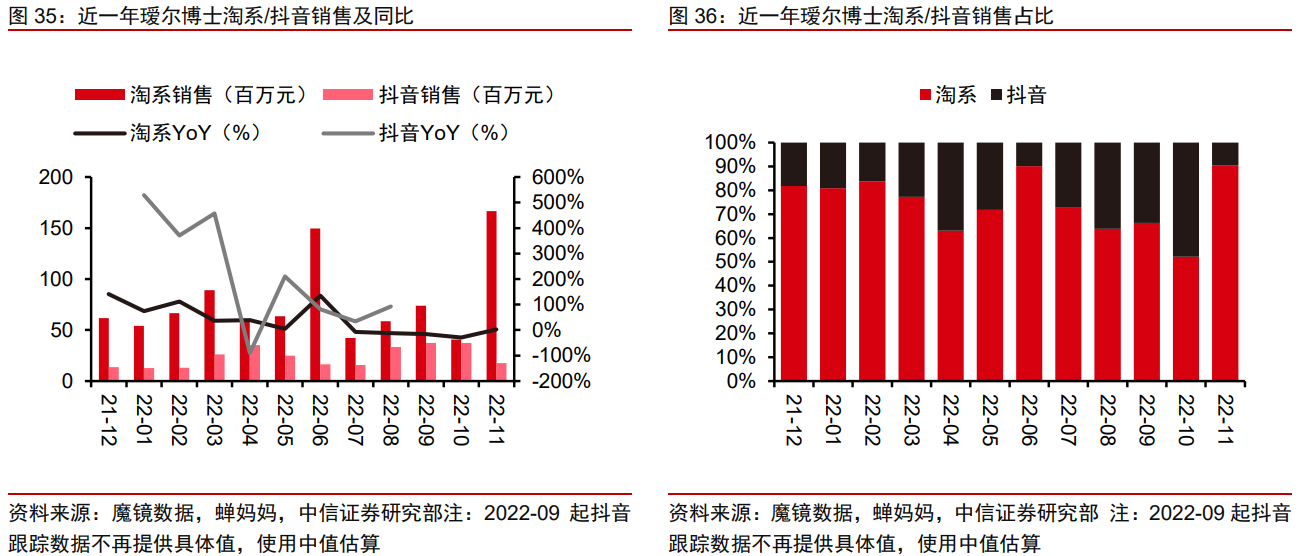 瑷尔博士在2022年下半年以来销售表现欠佳,除行业整体承压的因素外,品牌销售欠佳的原因主要有:2022年大单品上新缺位;品牌暂未进驻超头直播间。后续在品类拓展、渠道延伸方面有更大提升空间。