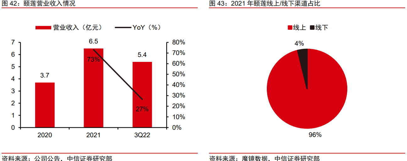 2)颐莲深耕玻尿酸护肤,依托集团玻尿酸产研优势,拓展“玻尿酸+”。玻尿酸功效护肤市场增长迅猛,据沙利文2022年市场规模预测为109亿,预测未来5年将维持41%的CAGR水平增长至2027年的617亿。2021年,颐莲实现营收6.5亿元/+73%;3Q22,品牌实现营收5.4亿元/+27%,维持较快增长水平。品牌定位大众价格带,性价比特质突出,其中补水喷雾为颐莲当前大单品、2022年1~10月收入贡献约59%。