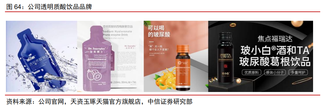 据头豹研究院数据,2021年中国企业透明质酸原料市场规模占全球规模的76%,其中华熙生物为市场最大供应商,占全球市场规模的44%,鲁商发展(焦点福瑞达)次之,占全球市场的15%。2021年,公司获批玻璃酸钠药品生产许可证。截至目前,公司暂未涉足医药级玻尿酸领域,预期未来随牌照落地,有望打开医药级增量市场空间。2021年1月,国家卫健委批准透明质酸用于普通食品添加,政策限制放开后行业迎增量空间。公司先后推出了玻小酸、伽美博士、玻小白、天资玉琢等透明质酸饮品品牌。综合公司玻尿酸研发生产实力,未来随市场消费者教育持续推进,有望解锁更多玻尿酸应用场景,推动食品级玻尿酸销售。