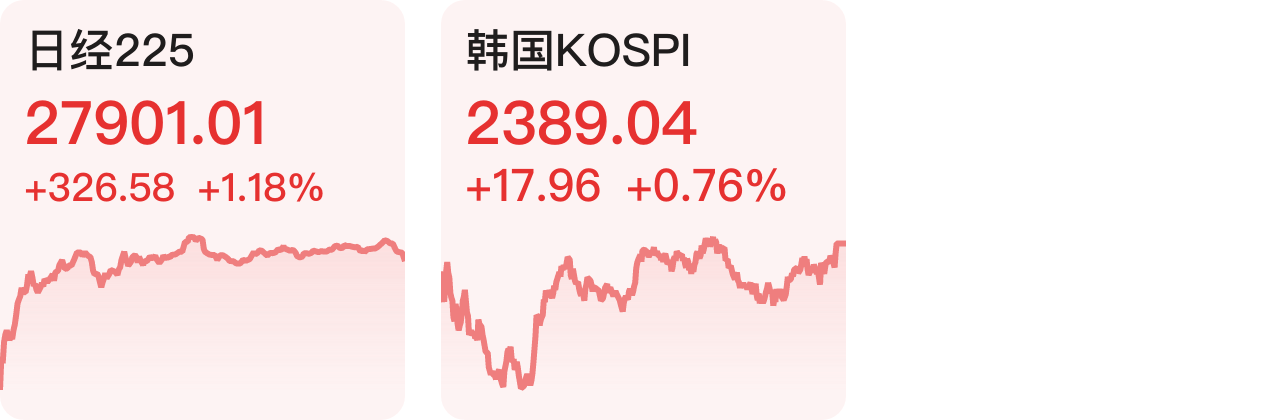 日经225指数涨1.18%,韩国KOSPI指数涨0.76%。