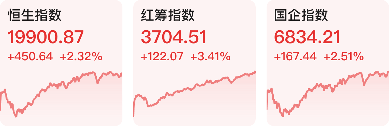 港股三大指数全线上涨。截至收盘,恒生指数涨2.32%,红筹指数涨3.41%,国企指数涨2.51%。恒生科技指数涨2.33%,内房股大涨,宝龙地产涨超22%,龙湖集团、富力地产涨超18%,热门科技股多数上涨,美团、百度集团涨超5%,哔哩哔哩、小米集团、小鹏汽车涨超3%。