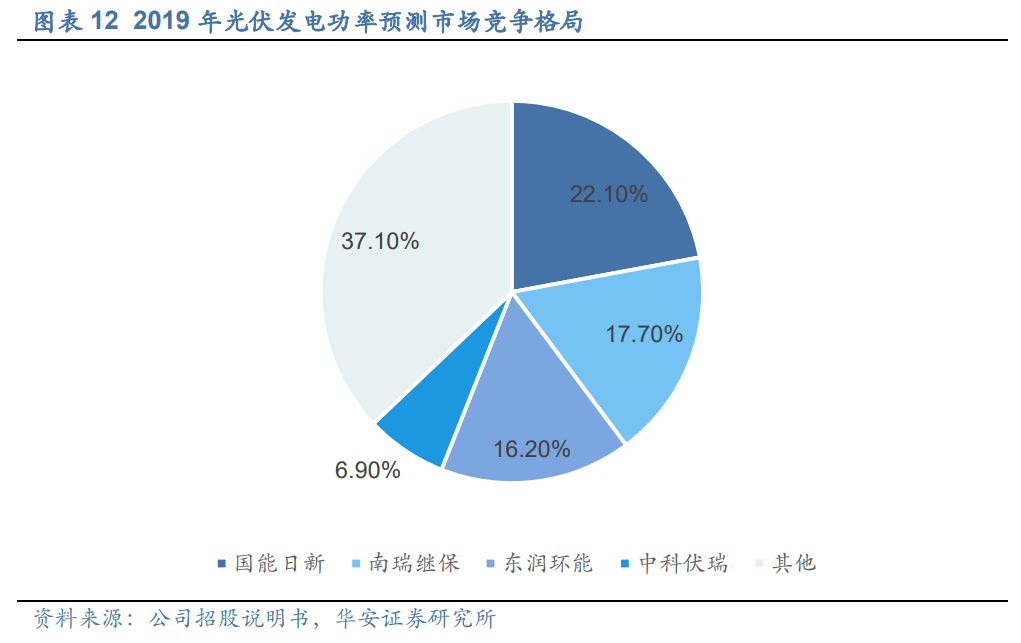 国能日新是新能源发电功率预测市场的领跑者,根据沙利文,2019年公司在光伏和风能发电功率预测市场的占有率分别为22.10%和18.80%,除公司外,光伏发电功率预测市场的主要企业还包括南瑞继保、东润环能、中科伏瑞,其市场占有率分别为17.70%、16.20%和6.90%;风力发电功率预测市场的主要企业还包括金风慧能、远景能源、东润环能和南瑞继保,其市场占有率分别为14.90%、13.30%、11.70%和6.30%。