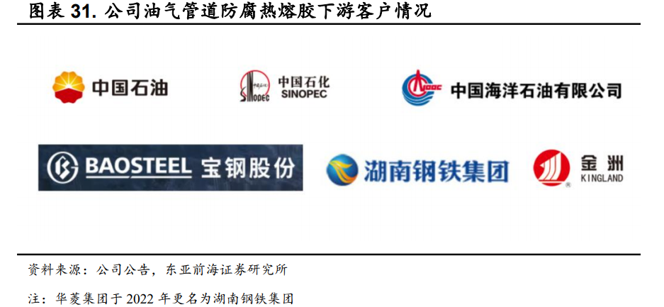 1)待功能性聚烯烃热熔胶扩产和技改项目实施完成后,公司功能性聚烯烃热熔胶产能有望达约11.05万吨/年:公司功能性聚烯烃热熔胶扩产项目预计于2023年12月投产。目前公司的复合建材热熔胶已应用于国内外多个大型工程以及中国高铁列车车厢制造,产品市场影响力不断扩大。公司油气管道防腐热熔胶已被中石油、中石化、中海油、宝钢股份、华菱集团、金洲管道等多家下游知名客户应用,同时可在国际市场上与国外知名厂商直接竞争。