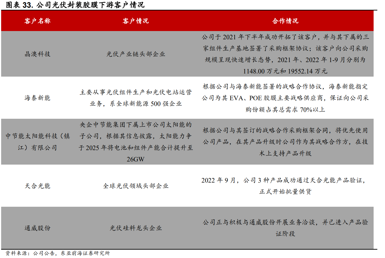公司持续推进光伏封装胶膜技术升级,陆续增加了产品种类,包括黑色组件用红外高反射黑色胶膜、N型TOPCon电池专用封装胶膜、N型异质结(HJT)电池专用封装胶膜,提高产品市场竞争力。公司与光伏封装胶膜原料供应商形成了良好的合作关系,且客户资源优质。公司为海泰新能指定的EVA、POE胶膜主要战略供应商,2022年9月,公司3种产品成功通过天合光能的产品验证,正式开始批量供货。同时公司积极与通威股份开展业务洽谈,已进入产品验证阶段。