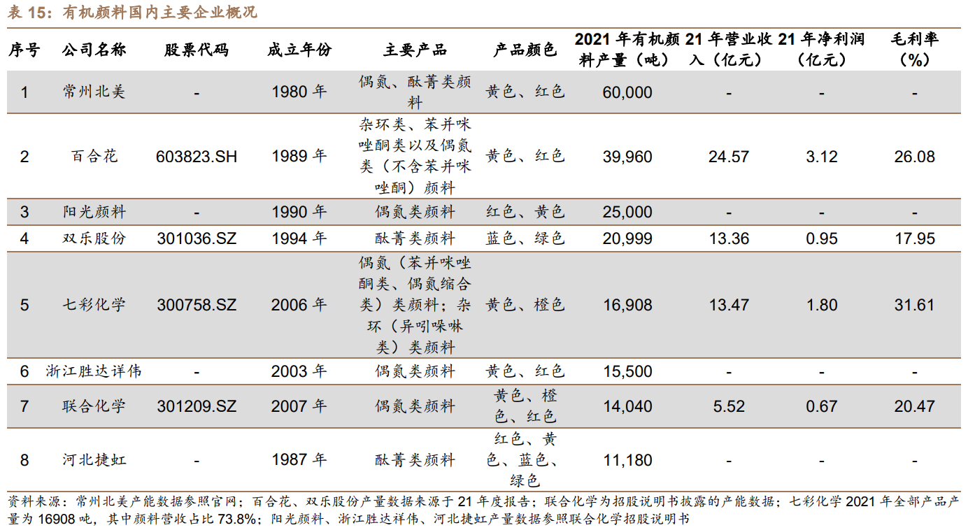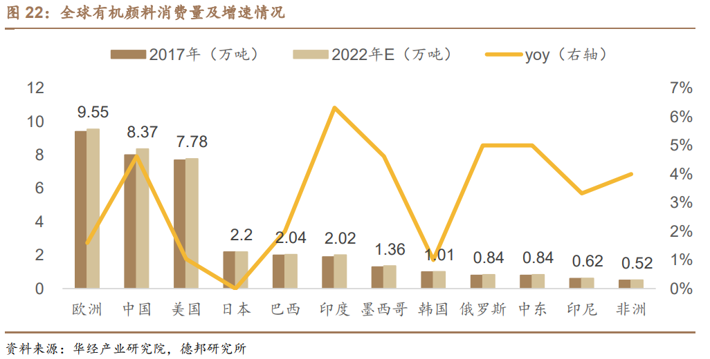 公司为国内最大的有机颜料专业生产企业之一,拥有年产 40000 吨有机颜料和 13000 吨颜料中间体的生产能力,产能水平排名行业前二,市场占有率按产能粗算约为 10%。有机颜料行业,从需求端而言,2022 年全球有机颜料消费量约为 40.7 万吨,2017-2022 年消费量增长率为 2.6%左右,增速平稳,其中高性能有机颜料由于耐热性、耐晒牢度、环保性及安全性佳,未来具备较大增长潜力。