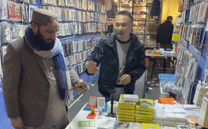 3月21日,证券时报记者在现场看到,上午10时许,国际商贸城一区一楼,很多商户的摊位门前已经围满了客人,工作人员手上拿着产品,向来自不同国家和地区的客商进行介绍,各种语言的交谈声不绝于耳。