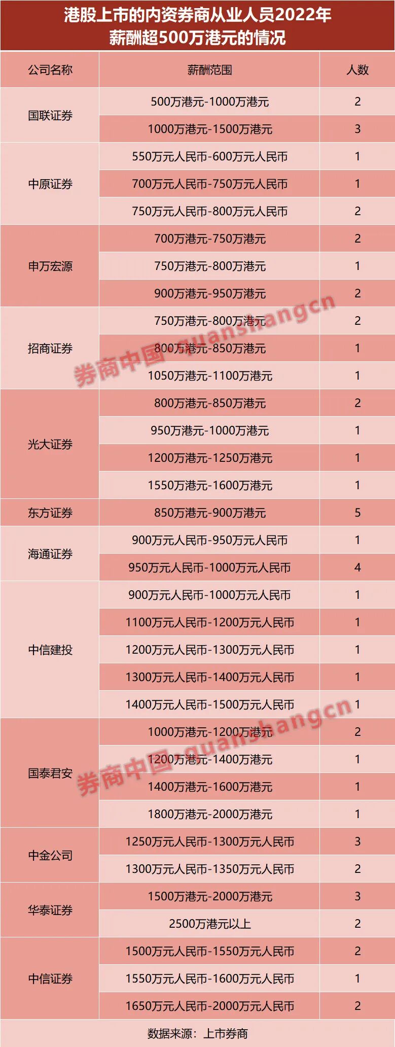 此外,光大证券薪酬在1200万港元至1600万港元的有2人;招商证券薪酬在1050万港元至1100万港元的有1人。
