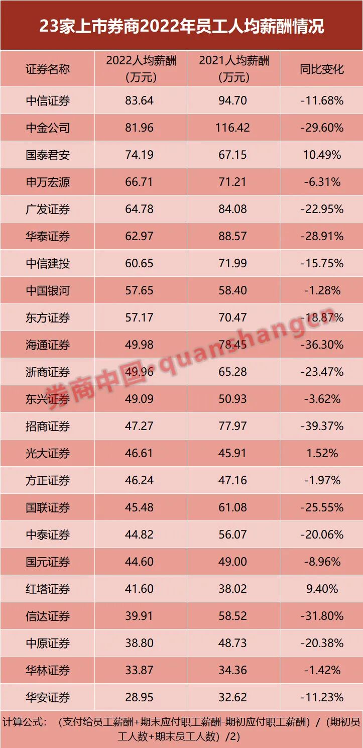 随着时间步入4月,截至4月1日,已有23家上市券商披露2022年年报,占比超过一半。除国信证券以外,多家大型券商均已披露完毕,有关“券商降薪潮”的数据也浮出水面。
