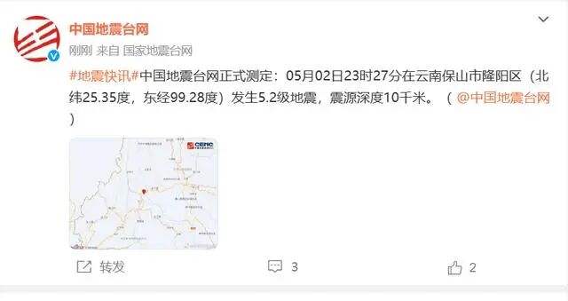 中国地震台网正式测定:5月2日23时27分在云南保山市隆阳区(北纬25.35度,东经99.28度)发生5.2级地震,震源深度10千米。央视总台记者从救援前线了解到,据不完全统计,云南隆阳5.2级地震已造成3人轻伤。核灾排查和各项救灾安置工作还在紧张开展中。