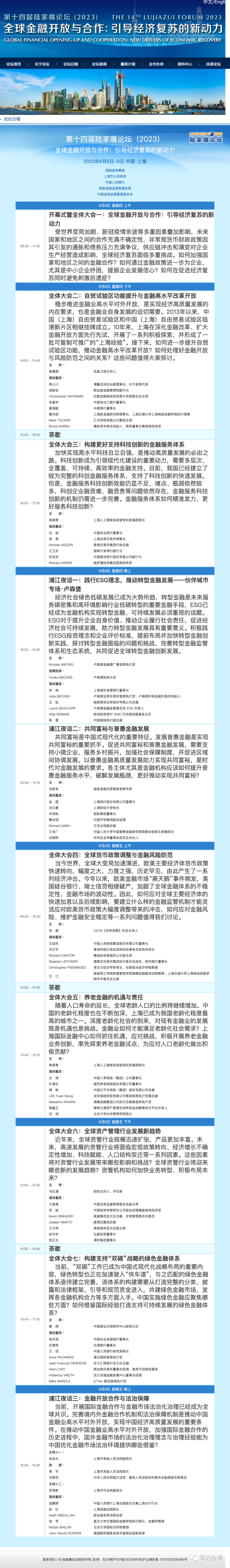 本次陆家嘴论坛议题涵盖当前经济、金融领域的热点问题,包括“自贸试验区功能提升与金融高水平改革开放”“构建更好支持科技创新的金融服务体系”“全球货币政策调整与金融风险防范”“养老金融的机遇与责任”“全球资产管理行业发展新趋势”“构建支持‘双碳’战略的绿色金融体系”和“浦江夜话一:践行ESG理念,推动转型金融发展——伙伴城市专场﹒卢森堡”“浦江夜话二:共同富裕与普惠金融发展”“浦江夜话三:金融开放合作与法治保障”等10个议题。