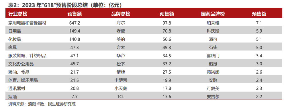 家电行业整体在618迎来高光时刻。民生证券研报显示,家电行业及品牌位列多个榜单前列,预售额几乎是第二名的5倍。