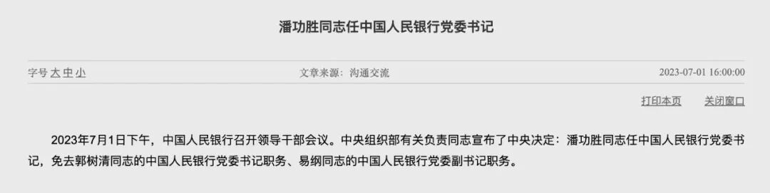 从深度参与两大国有银行股改上市,到躬身入局中国金融市场改革开放浪潮,职业生涯将满30年的潘功胜迎来新使命。7月1日下午,中国人民银行召开领导干部会议。中央组织部有关负责同志宣布了中央决定:潘功胜同志任中国人民银行党委书记,免去郭树清同志的中国人民银行党委书记职务、易纲同志的中国人民银行党委副书记职务。
