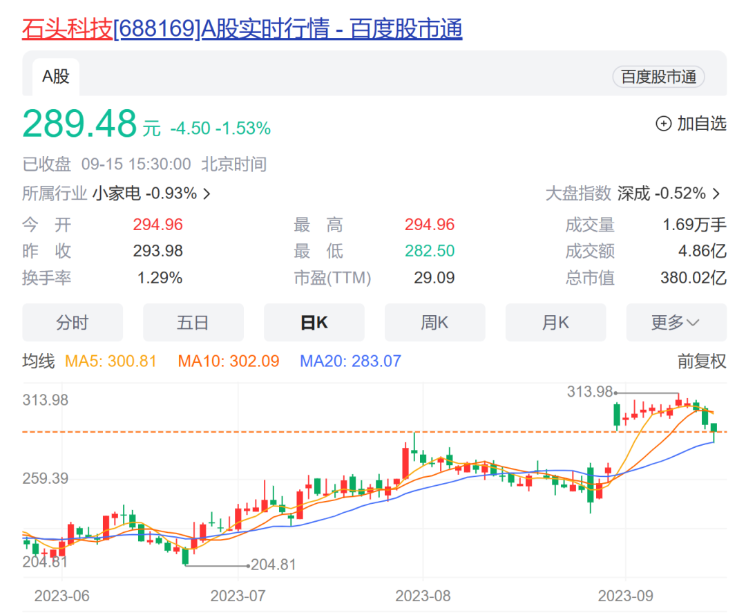 受此超预期影响,石头科技在二级市场也受到资金追捧。财报发布次日股价收涨近10%,此后连续多日收红,最高触及313.98元每股的近一年高点,不过近几日有所回调,最新报收289.48元每股,总市值380亿元。