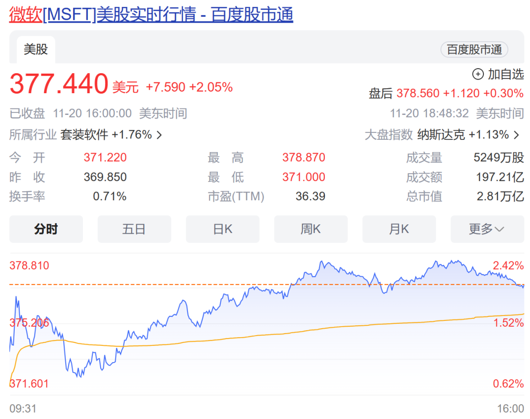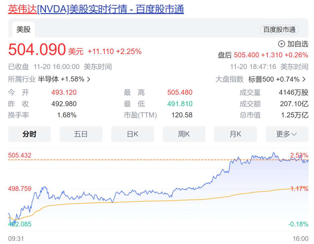 11月20日,英伟达、微软双双创下收盘历史新高,推动科技股集体上涨。其中英伟达当日上涨2.25%,报收504.09美元/股,微软当日涨幅为2.05%,报收377.44美元/股。