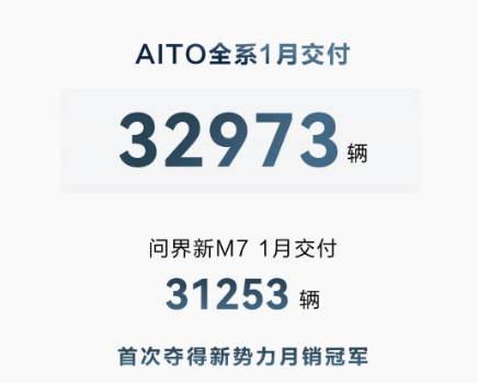 其中,华为与赛力斯联手打造的AITO问界1月份全系交付新车32973辆,环比增长34.76%,首次成为中国市场新势力品牌月销量冠军。
