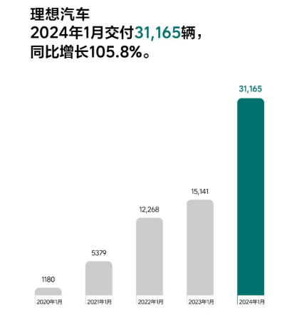 紧随其后发布交付数据的理想汽车,也在2024年制定了更高的销量目标。数据显示,2024年1月,理想汽车共计交付新车31165辆,同比增长105.8%。自交付以来,理想汽车累计交付量达到664529辆。