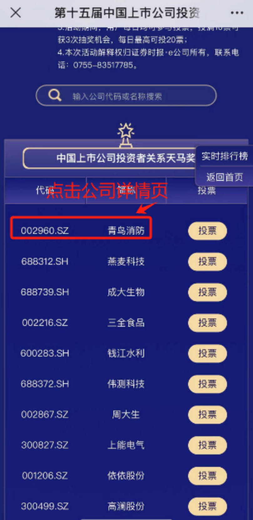 4.通过顶部搜索框,以股票代码、公司简称或人名搜索入围奖项,为您心仪的公司投票;