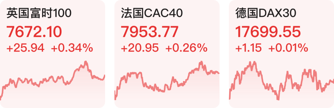 欧洲三大指数全线上涨。截至收盘,英国富时100指数涨0.34%,法国CAC40指数涨0.26%,德国DAX30指数涨0.01%。
