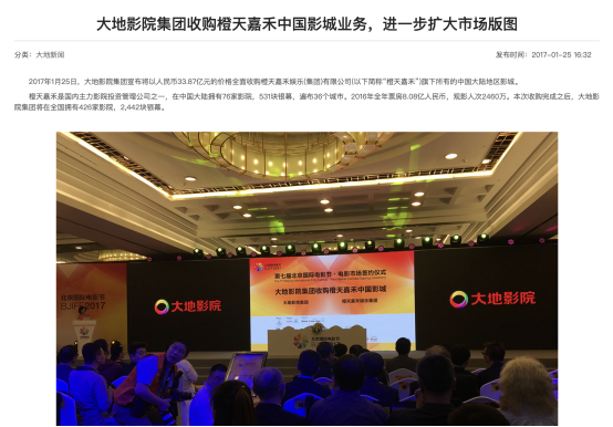 2017年,大地影院接连公布了对橙天嘉禾、福建中瑞两家影投公司的收购事项。尤其是2017年1月25日,大地影院宣布,以33.87亿元的价格全面收购橙天嘉禾娱乐(集团)有限公司(以下简称“橙天嘉禾”)旗下所有的中国内地地区影城,共76家影院,531块银幕。收购完成之后,大地影院在全国的影院升至426家影院,2442块银幕。