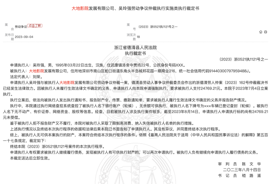 浙江某地大地影院前员工告诉记者,2021年他所在的大地影院因拖欠物业租金关闭,公司拖欠自己4个月工资一直未能发放。后来他向法院提起诉讼,胜诉后大地影院却无财产可执行,他的薪水也一直被拖欠至今。
