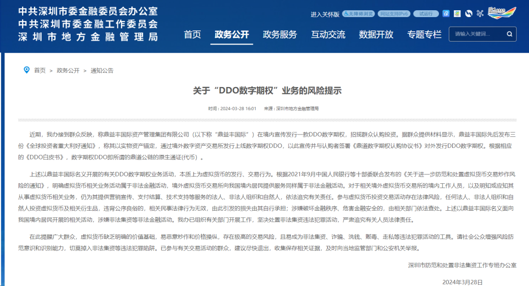 3月28日,深圳市防范和处置非法集资工作专班办公室(下称“深圳处非办”)在深圳市地方金融管理局发文称,鼎益丰国际资产管理集团有限公司(简称“鼎益丰”)在境内宣传发行一款DDO数字期权,招揽群众认购投资。该行为本质上为虚拟货币的发行、交易行为,属非法金融活动。