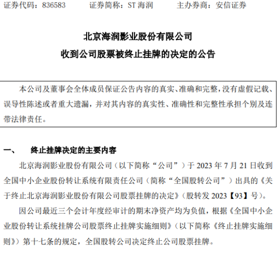 刘燕铭旗下还有一家以电影为主业、曾在新三板挂牌的北京海润影业股份有限公司(下称“海润影业”)。海润影业于2016年4月7日起在新三板挂牌。挂牌后,公司的业绩波动较大。2023年7月24日,海润影业宣布,因公司最近三个会计年度经审计的期末净资产均为负值,根据有关规定,全国股转公司决定终止公司股票挂牌。
