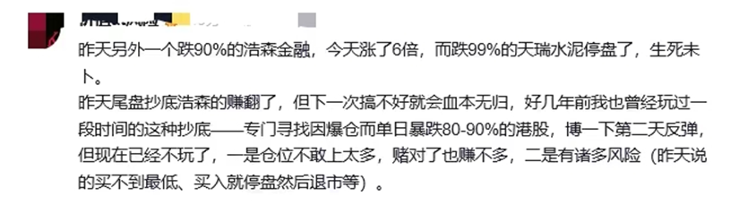 虽然股吧内对“一夜暴富”的幻想者众多,但也不乏提示风险、现身说法的股友。“这种大起大落吸引韭菜,进来也不一定能跑出去,跑出去也不一定能赚钱。”