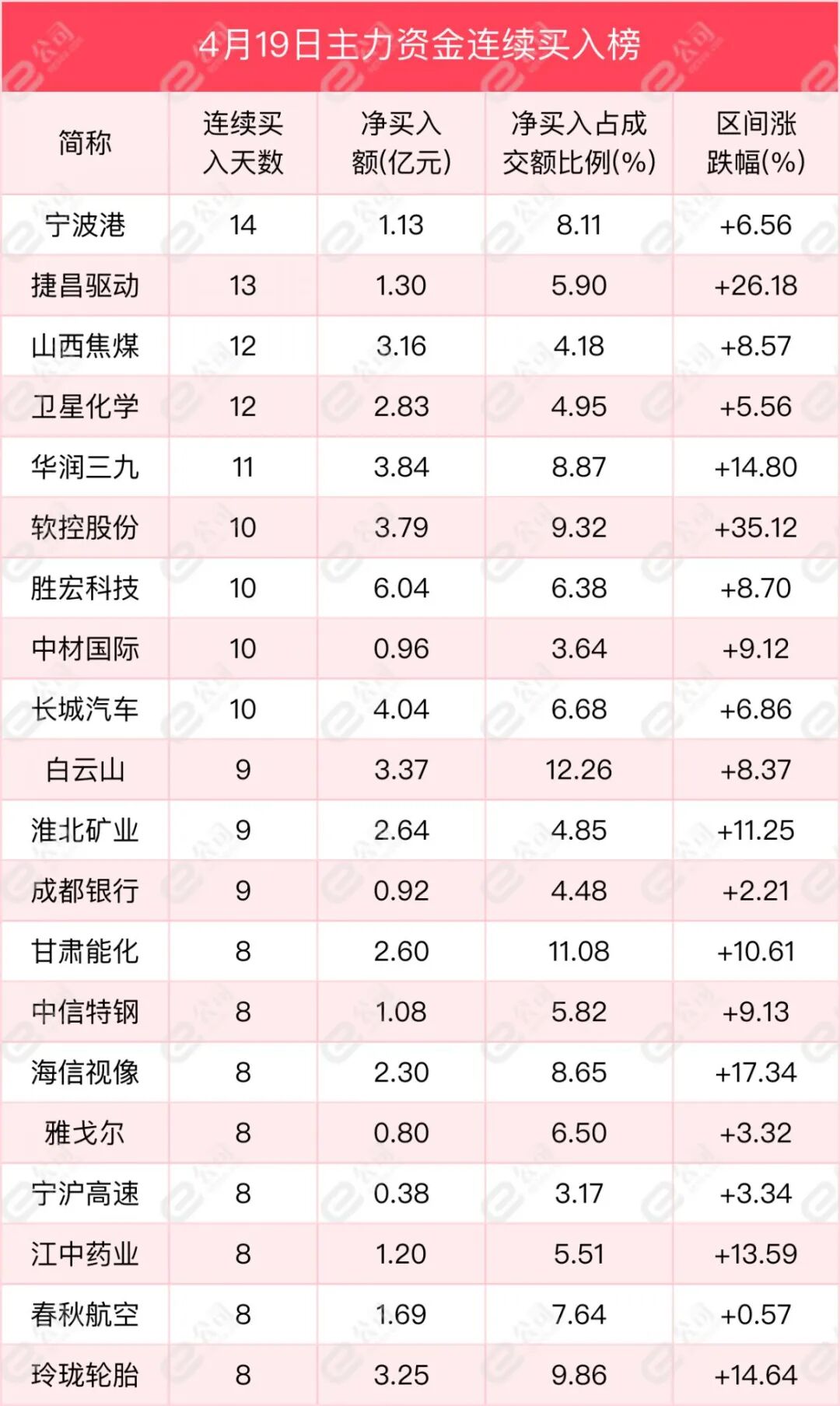 从连续买卖来看,宁波港、捷昌驱动、山西焦煤获主力资金连续净买入天数居前,分别为14天、13天、12天,期间净买入额分别为1.13亿元、1.3亿元、3.16亿元,占期间成交额比例分别为8.11%、5.9%、4.18%。