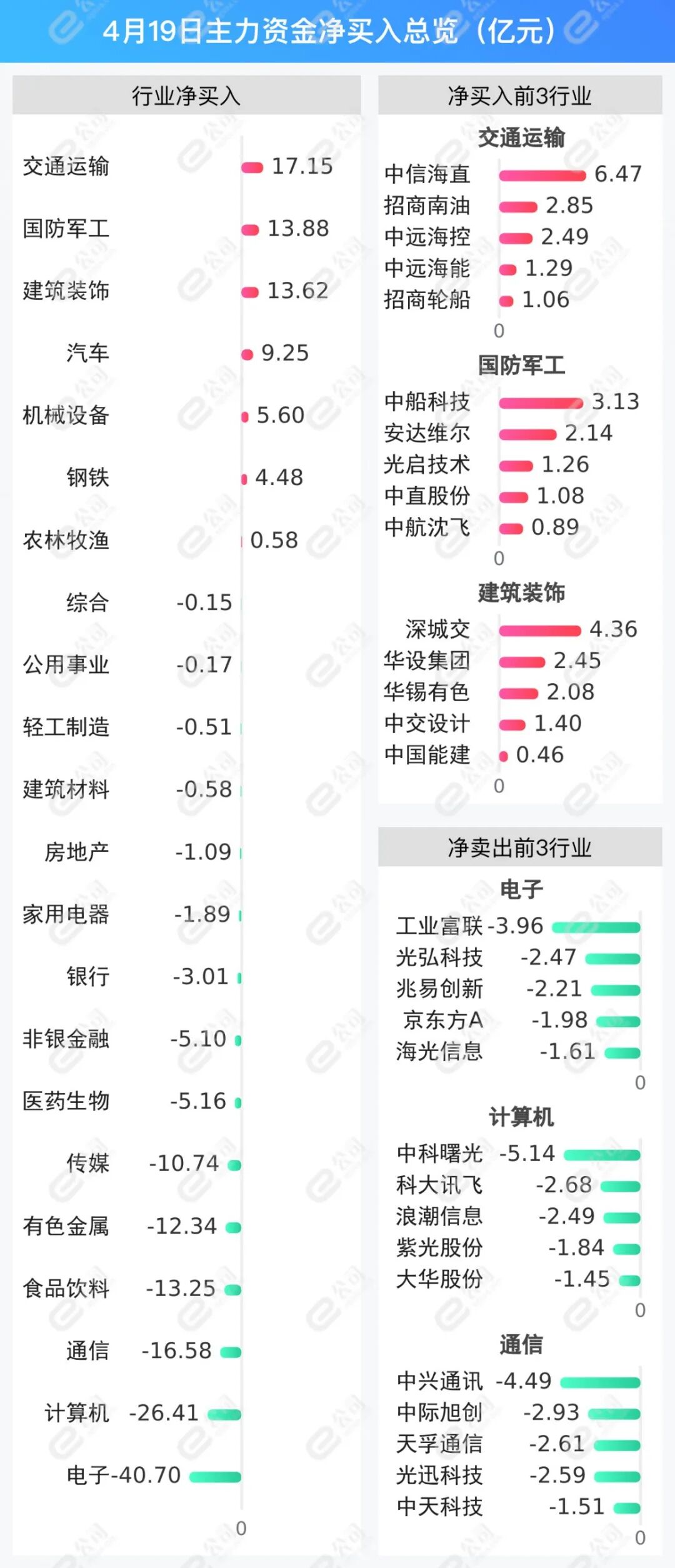 从行业层面看,交通运输、国防军工、建筑装饰获主力资金净买入金额居前,分别为17.15亿元、13.88亿元、13.62亿元。