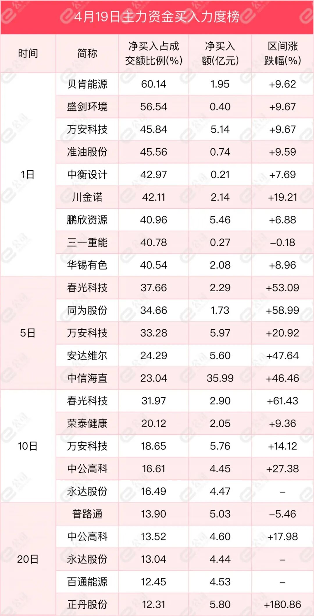从主力资金买卖力度来看,贝肯能源、盛剑环境、万安科技获主力资金大力买入,净买入额占当日成交额比例分别为60.14%、56.54%、45.84%,净买入额分别为1.95亿元、0.4亿元、5.14亿元。
