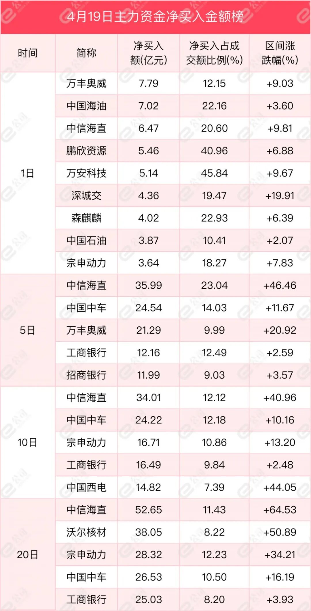 从买卖金额来看,万丰奥威、中国海油、中信海直获主力资金净买入金额居前,分别为7.79亿元、7.02亿元、6.47亿元,占当日成交额12.15%、22.16%、20.6%。