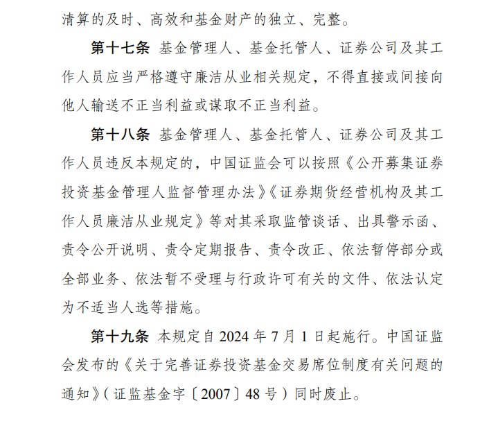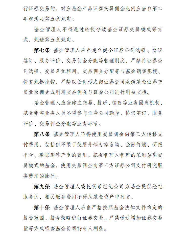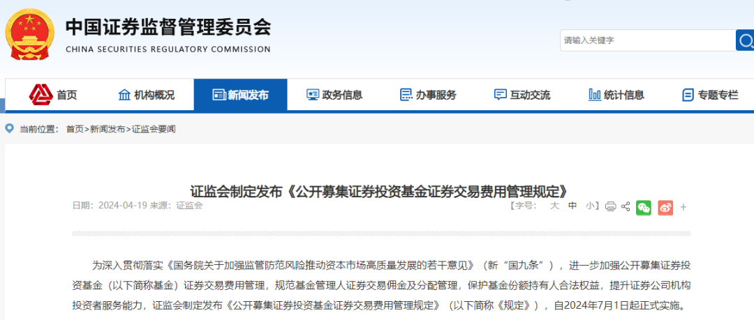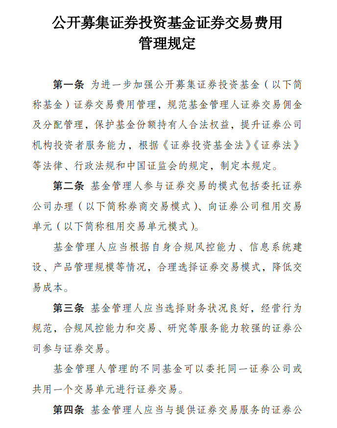 为深入贯彻落实《国务院关于加强监管防范风险推动资本市场高质量发展的若干意见》(新“国九条”),进一步加强公开募集证券投资基金(以下简称基金)证券交易费用管理,规范基金管理人证券交易佣金及分配管理,保护基金份额持有人合法权益,提升证券公司机构投资者服务能力,证监会制定发布《公开募集证券投资基金证券交易费用管理规定》(以下简称《规定》),自2024年7月1日起正式实施。