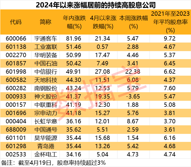 宗申动力并非个例,高股息板块持续受追捧,持续高股息的公司在近期大跌行情中又“赢麻了”。据证券时报·数据宝统计,2021年至2023年股息率持续超过3%的公司共计141家。截至4月19日,沪指年内涨3.04%,4月份以来涨0.79%;上述141家公司年内股价平均涨近14%,4月份以来平均涨5.3%。自上周五新“国九条”出台以来,上述141家公司本周股价平均涨3.1%,沪指同期涨1.52%。