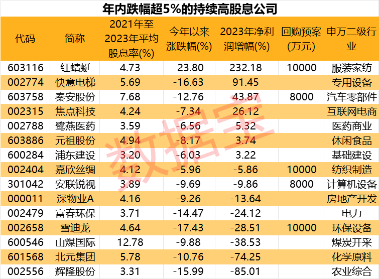 红蜻蜓净利润增幅居首,2023年净利润同比增长232.18%,其过去3年平均股息率4.73%;快意电梯过去3年平均股息率高达5.69%,年内股价跌幅接近15%,2023年净利润同比增长91.45%;另外,秦安股份、焦点科技2023年净利润增幅均超过25%。