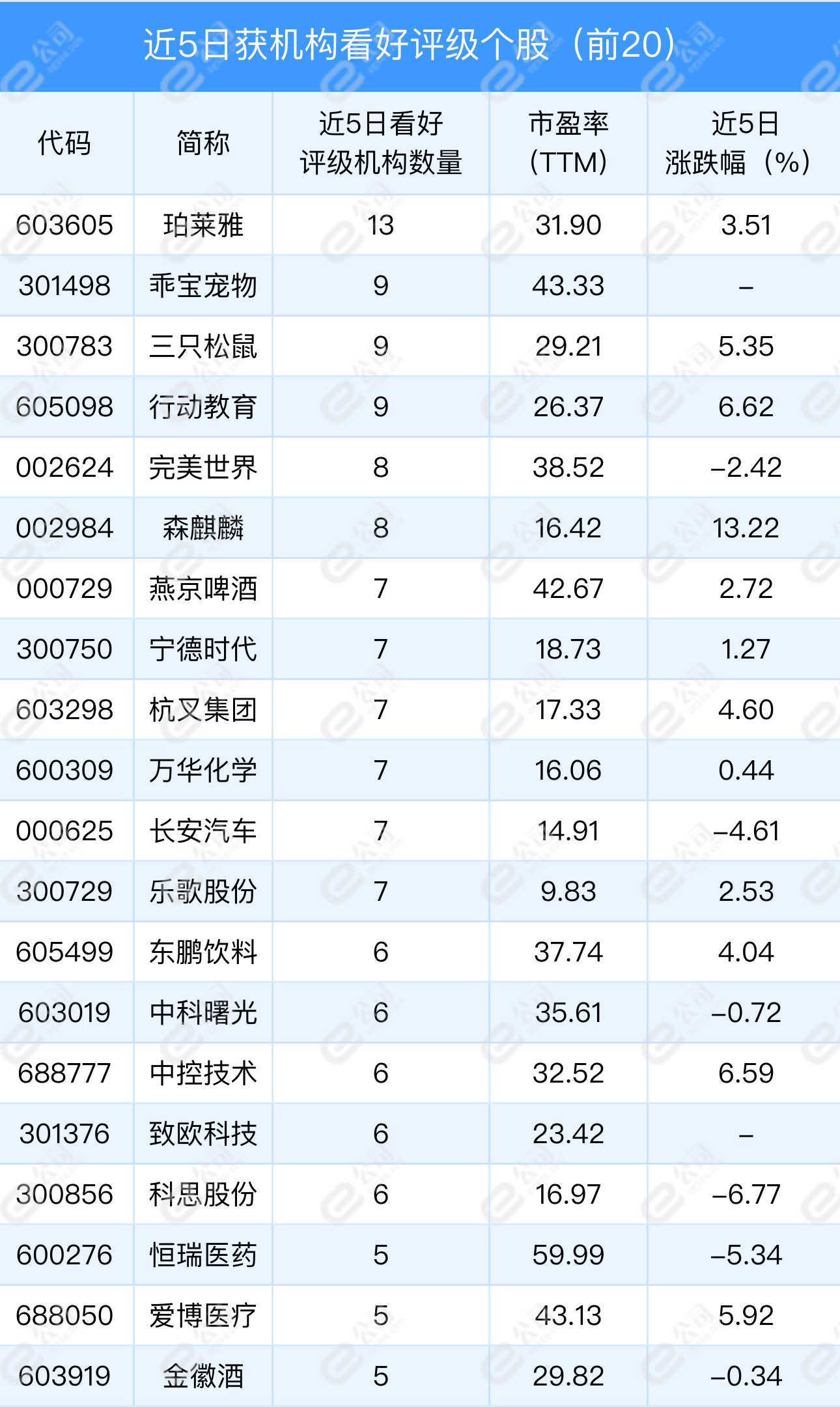 85只个股在近期被机构集中推荐,近5日内机构给予“买入”或“增持”等看好评级家数均逾3家及以上。具体来看,珀莱雅(13家)、乖宝宠物(9家)、三只松鼠(9家)、行动教育(9家)、完美世界(8家)、森麒麟(8家)、燕京啤酒(7家)、宁德时代(7家)等8只个股近期机构看好评级家数居前,均达到5家以上,此外,包括巨化股份、龙迅股份、晶晨股份、华测导航、润泽科技等在内的30只个股期间机构看好评级家数均在2家以上。
