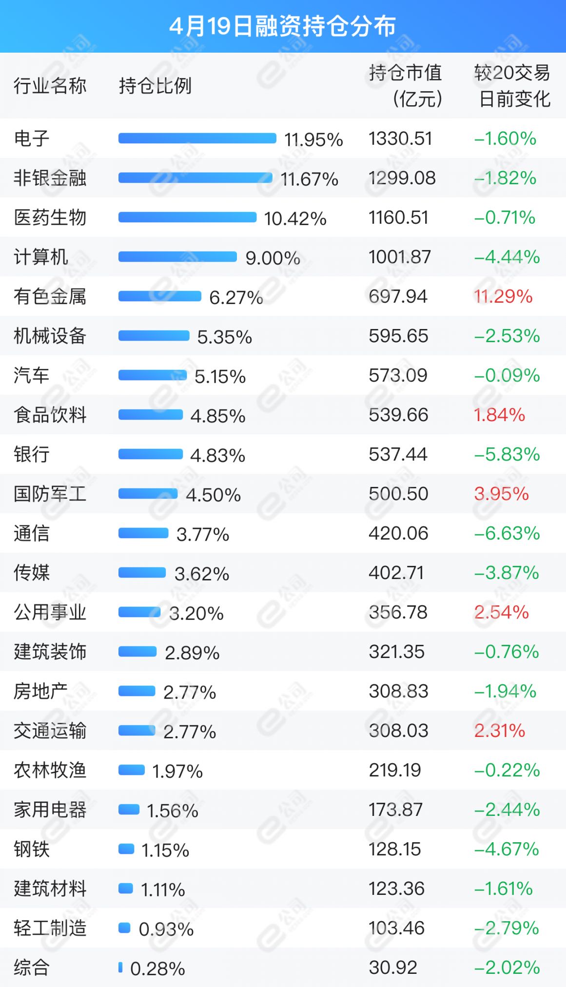 e公司数据统计显示,截至4月19日,融资持仓市值前五行业为电子、非银金融、医药生物、计算机、有色金属,占持仓总市值49.31%。