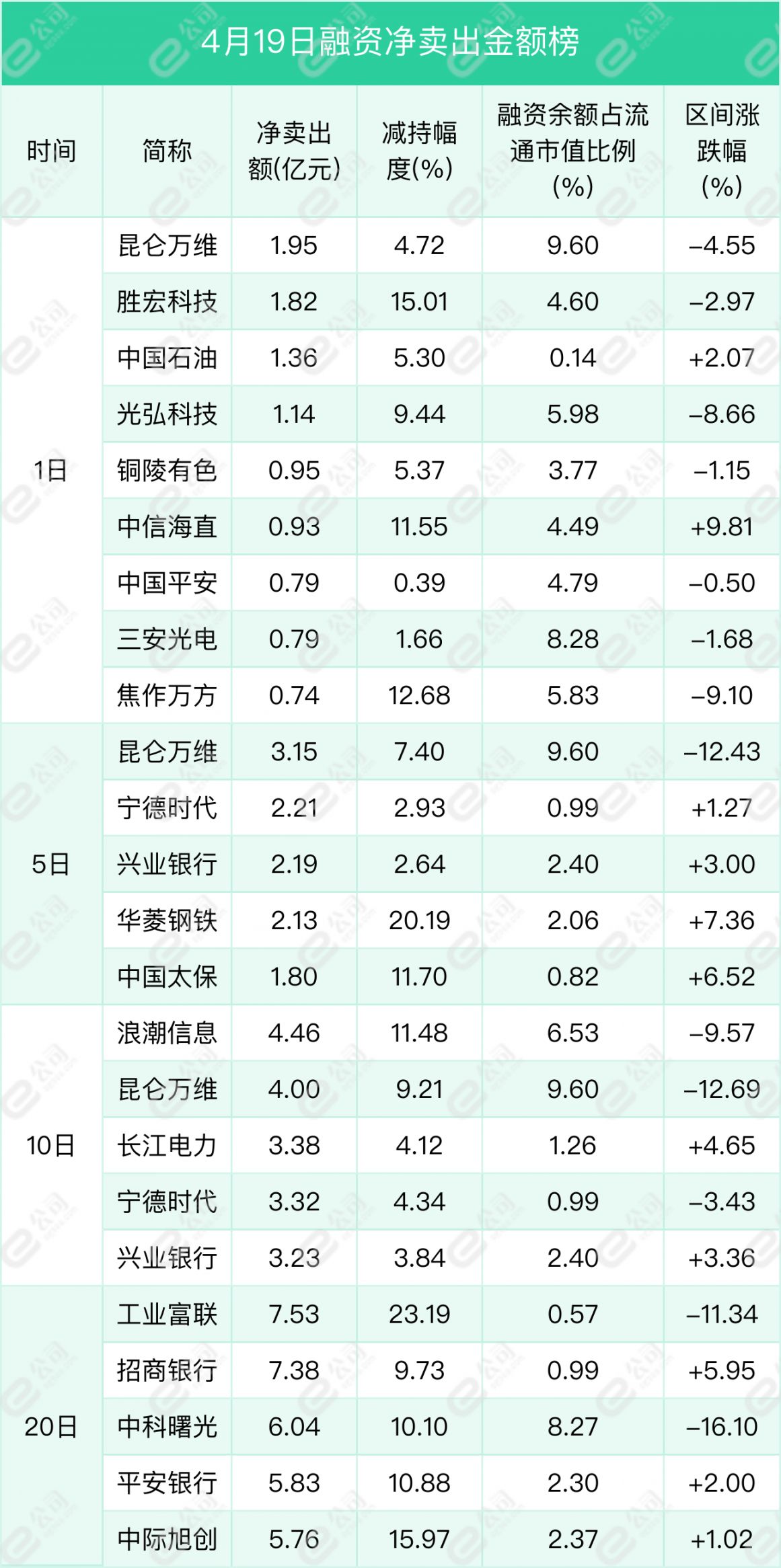 昆仑万维、胜宏科技、中国石油遭融资净卖出金额居前,分别为1.95亿元、1.82亿元、1.36亿元,减持幅度分别为4.72%、15.01%、5.3%。
