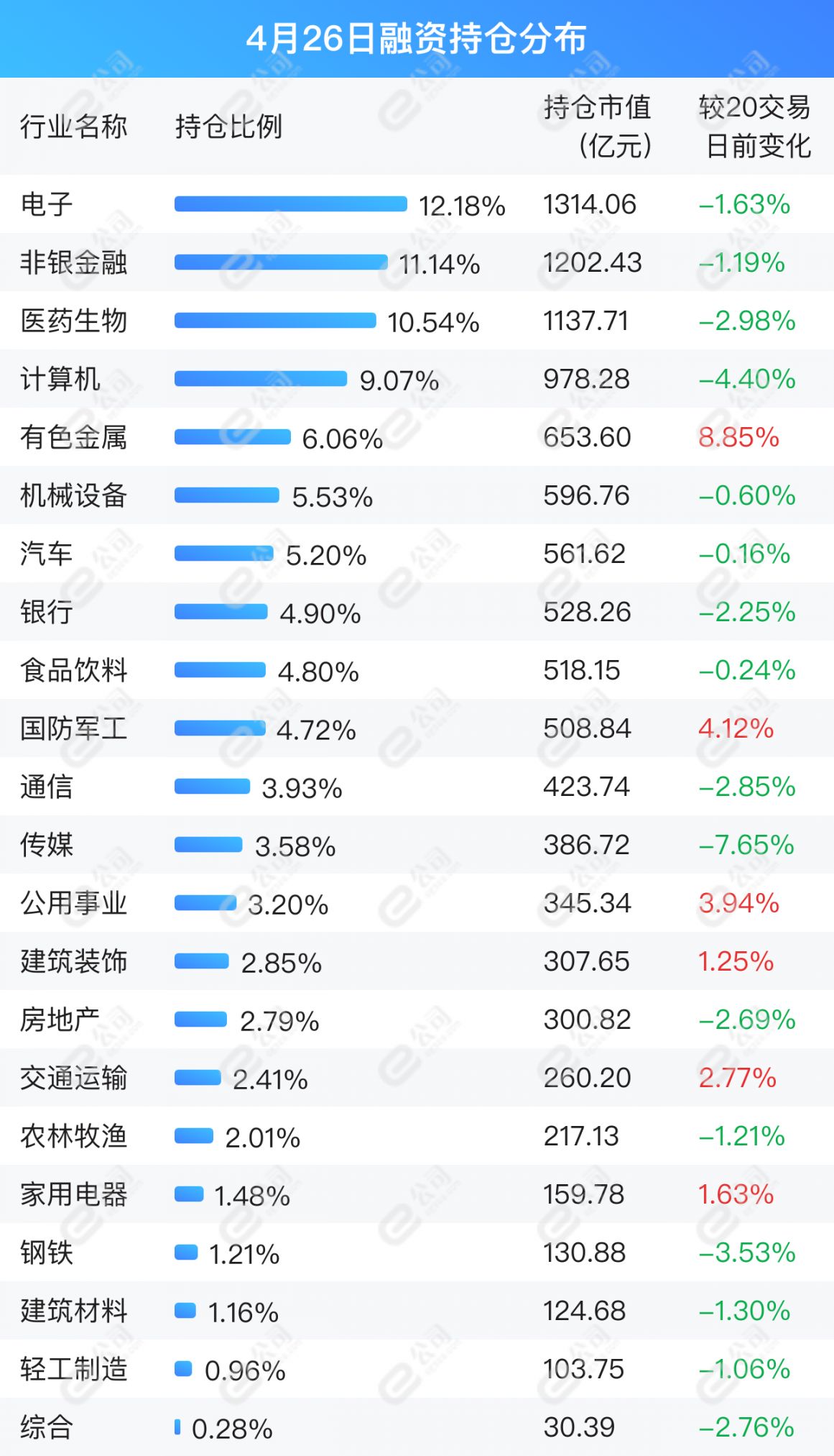 e公司数据统计显示,截至4月26日,融资持仓市值前五行业为电子、非银金融、医药生物、计算机、有色金属,占持仓总市值48.99%。